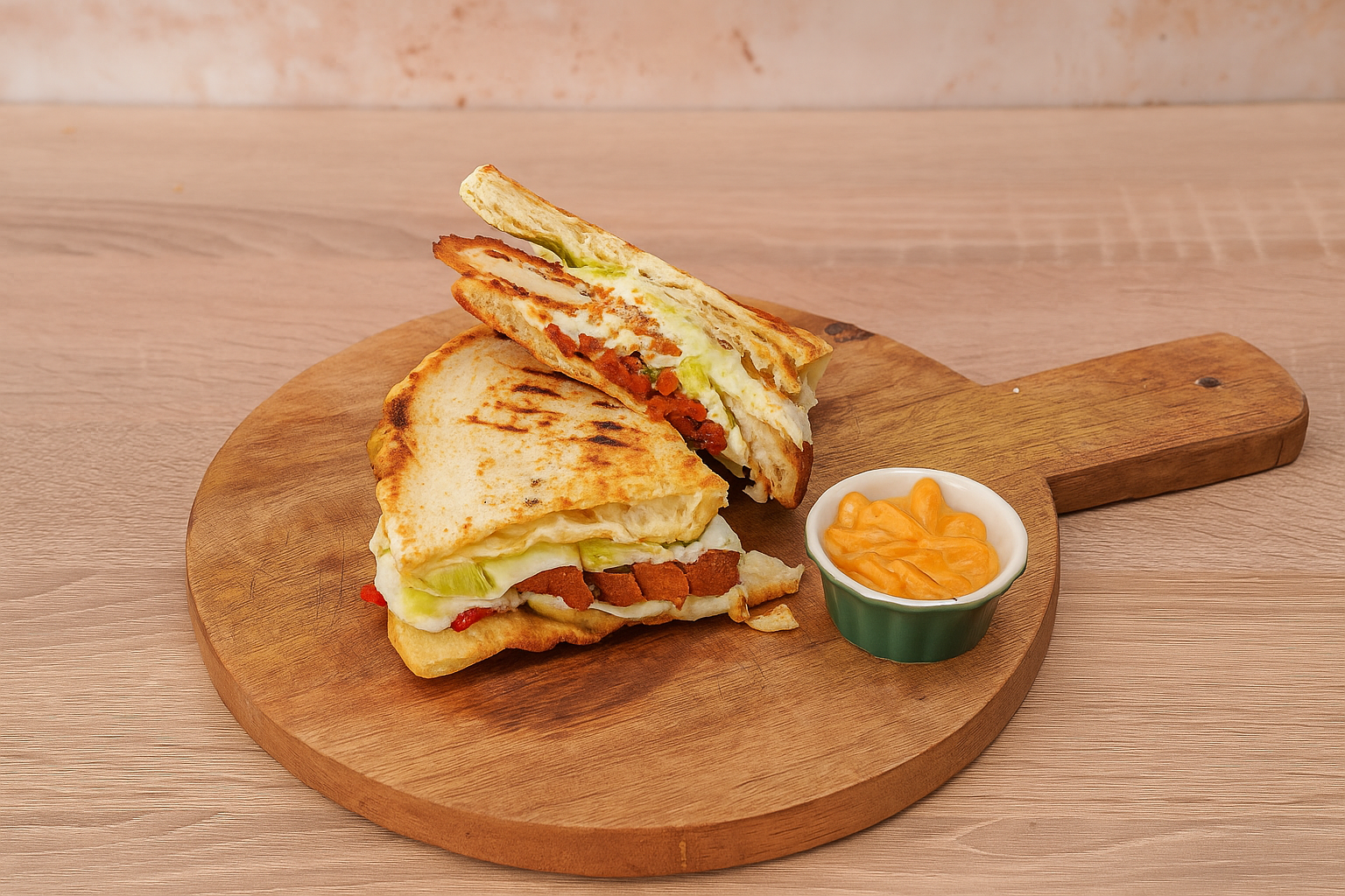 - On the unoiled side of two bread slices, spread basil pesto evenly. Layer with sliced mozzarella, cooked chicken strips, fresh tomato slices, sun-dried tomatoes, and fresh basil leaves.